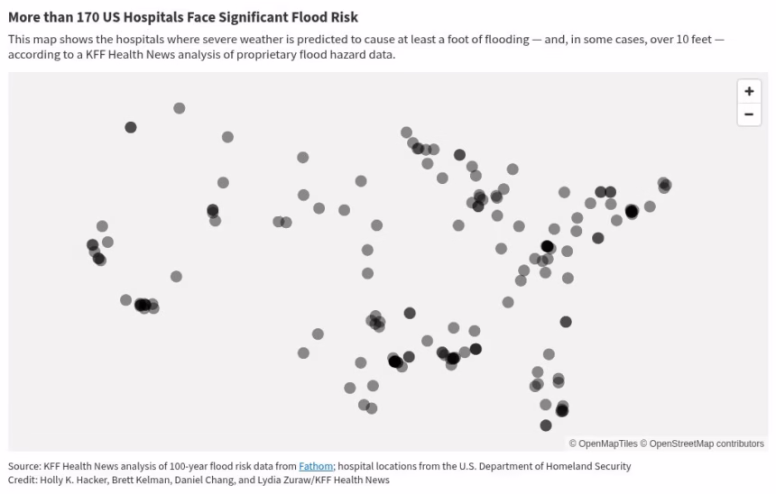 The KFF Health News investigation identified more than 170 hospitals facing a flood risk by comparing the locations of more than 7,000 facilities to peer-reviewed flood hazard mapping provided by Fathom, a United Kingdom company that simulates flooding in spaces as small as 10 meters using laser-precision elevation measurements from the U.S. Geological Survey.