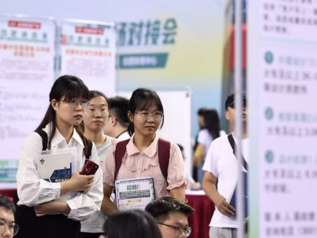 Young women attend a job fair for university graduates in Anhui province, China. Photo: Reuters