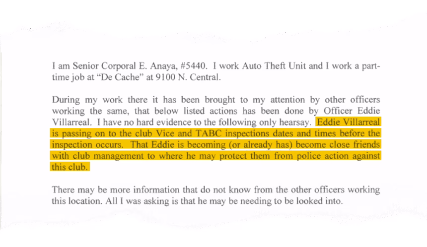 Senior Corporal Edward Anaya alleges that Villarreal tipped off the owners of another club to planned raids from the vice squad and state alcohol regulators. Dallas Police Department’s internal affairs unit investigates the complaint and eventually finds no violation of police policy.