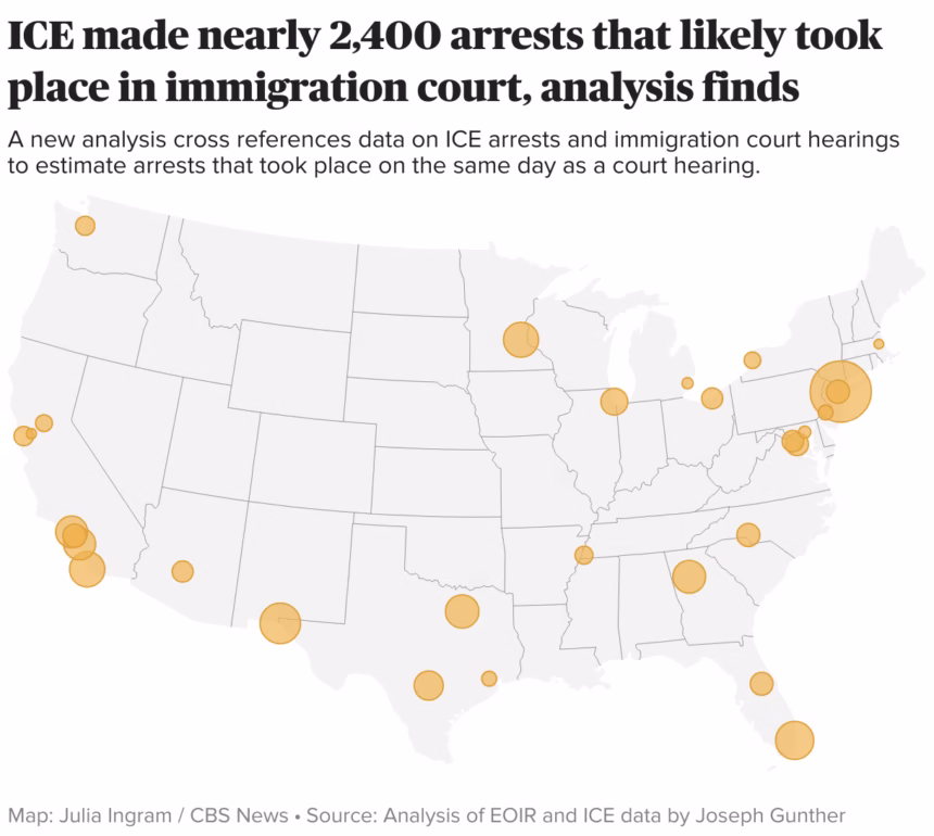 ICE made nearly 2,400 arrests that likely took place in immigration court, analysis finds (Symbol map)