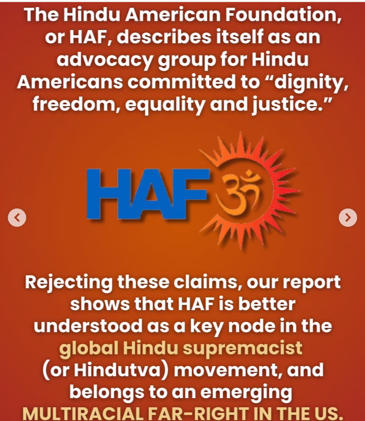 The report situates HAF’s role within a broader ideological assemblage of Hindu-right actors and supremacist currents in the US. Through this alignment, the organisation becomes a conduit for Islamophobia, casteism and other exclusionary narratives circulating within segments of the Indian American community.