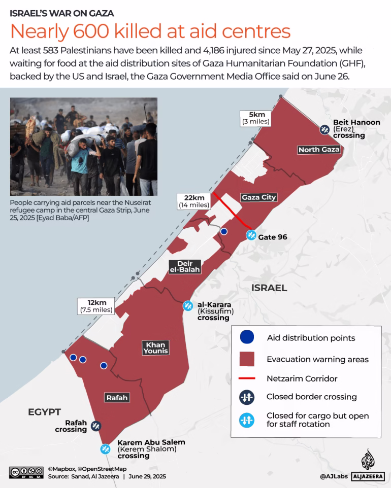 The killings have occurred daily as famine looms over the besieged enclave. International organisations have warned for weeks that Gaza’s 2.1 million residents face catastrophic food shortages with markets emptied, clean water scarce, and aid deliveries sporadic and dangerous.INTERACTIVE - Gaza aid distribution_june 29, 2025-B-1751203612