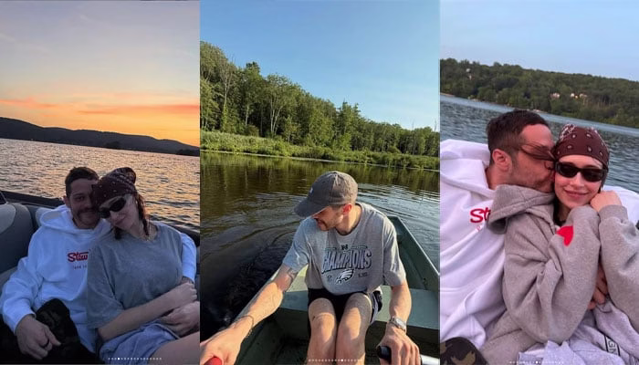 In another shot from the same outing, the 31-year-old comedian and actor was captured planting a sweet kiss on his girlfriend’s cheek. A third image showed the comedian rowing the boat solo.