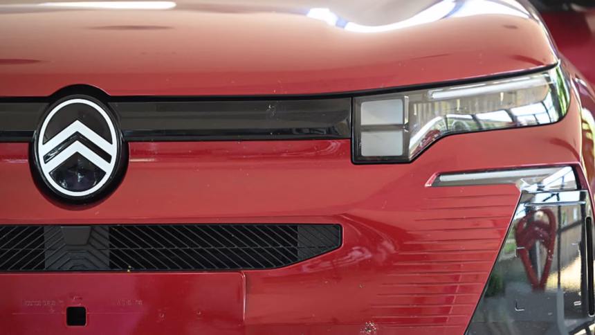 This photograph shows the front logo of a car at the new Citroen C5 Aircross’ production line in the Stellantis car maker plant in Chartres-de-Bretagne, near Rennes, western France, on July 3, 2025.