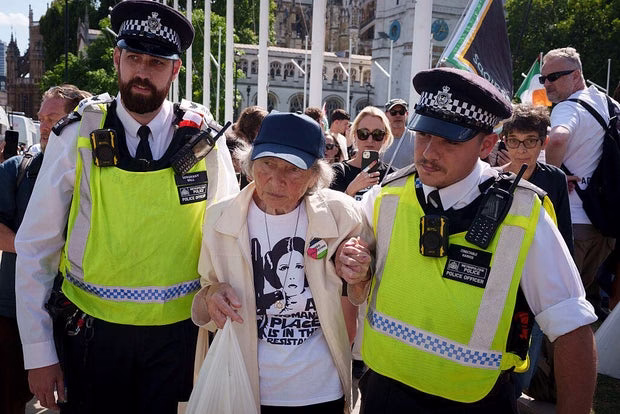 An elderly activist is arrested in Parliament Square in London, England, on Aug. 9, 2025, by police officers during a protest to show support for the Palestine Action group, which is a banned organization in the U.K.
