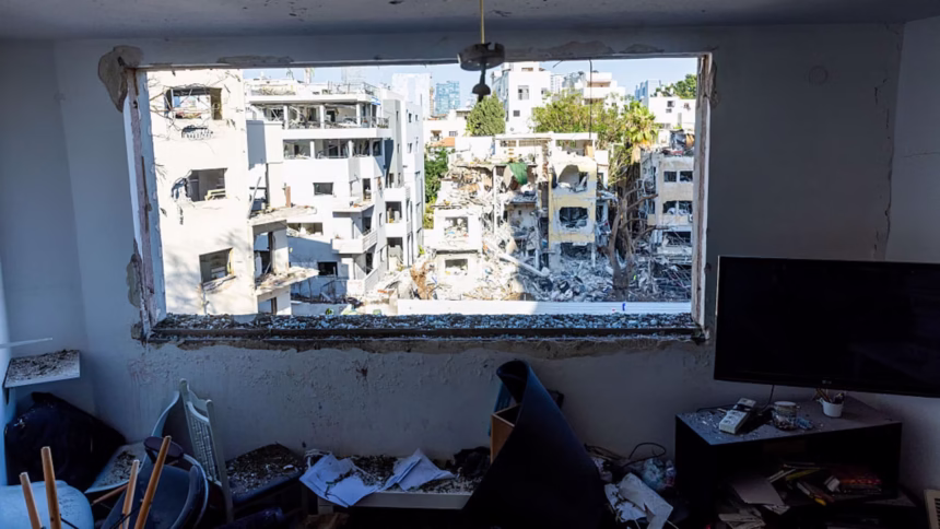 A general view of the partially collapsed buildings damaged by some of the ballistic missiles launched by Iran on June 18, 2025 in Tel Aviv, Israel.