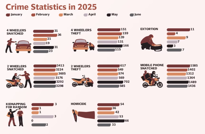 Between January and November 2024, Karachi recorded 66,530 such incidents, averaging 6,048 per month and 199 per day, according to CPLC data. These included 1,913 car thefts/snatchings (6 daily), 46,404 motorbike thefts/snatchings (139 daily), and 18,213 phone snatchings (55 daily). Based on this trend, the total number of incidents in 2024 alone likely exceeds 72,000.